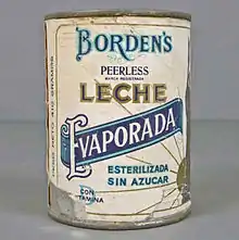 Evaporated milk, known in some countries as "unsweetened condensed milk",[1] is a shelf-stable canned cow’s milk product where about 60% of the water has been removed from fresh milk. It differs from sweetened condensed milk, which contains added sugar. Sweetened condensed milk requires less processing to preserve since the added sugar inhibits bacterial growth.[2] The production process involves the evaporation of 60% of the water from the milk, followed by homogenization, canning, and heat-sterilization.[3]