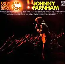 Everybody Oughta Sing A Song is the second solo studio album by Australian pop singer John Farnham (billed then as Johnny Farnham) and was released on EMI Records in November 1968.[1][2][3] Its first single, released in July, was the double A-sided, "Jamie"/"I Don't Want To Love You", which peaked at No. 8 on the Go-Set National Singles Charts.[1][4] The second single, "Rose Coloured Glasses" was released in October and peaked at No. 16.[1][5] Writers on the album included Hans Poulson, Neil Diamond and Quincy Jones. The album was re-released in 1974 with a different cover, it shows Farnham performing live on stage, whereas the initial 1968 release had him leaning against a Holden Monaro (see infobox at right).