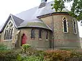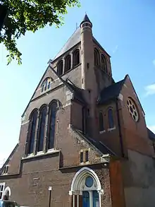 Among Christian's best original churches are Holy Trinity, Sunk Island, in the East Riding of Yorkshire (completed in 1877),[43] St Matthew's Church in Cheltenham, Gloucestershire (1878–79),[44] and his masterpiece St Mark's Church, Leicester (1869–72),[45] all cited in his RIBA Royal Gold Medal award of 1887. Holy Trinity displays his most typical red brick lancet style with nave and chancel under a single steep-pitched high roof, a deep apse to the chancel and a bold impressive tower topped by a pyramidal spire. The tower has another familiar feature, a projecting circular stair-turret to its east side which is capped by its own small curved roof.[46]