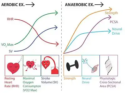 Developing research has demonstrated that many of the benefits of exercise are mediated through the role of skeletal muscle as an endocrine organ. That is, contracting muscles release multiple substances known as myokines which promote the growth of new tissue, tissue repair, and multiple anti-inflammatory functions, which in turn reduce the risk of developing various inflammatory diseases.[111] Exercise reduces levels of cortisol, which causes many health problems, both physical and mental.[112] Endurance exercise before meals lowers blood glucose more than the same exercise after meals.[113] There is evidence that vigorous exercise (90–95% of VO2 max) induces a greater degree of physiological cardiac hypertrophy than moderate exercise (40 to 70% of VO2 max), but it is unknown whether this has any effects on overall morbidity and/or mortality.[114] Both aerobic and anaerobic exercise work to increase the mechanical efficiency of the heart by increasing cardiac volume (aerobic exercise), or myocardial thickness (strength training). Ventricular hypertrophy, the thickening of the ventricular walls, is generally beneficial and healthy if it occurs in response to exercise.