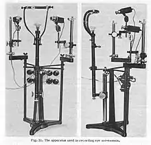 The first non-intrusive eye-trackers were built by Guy Thomas Buswell in Chicago, using beams of light that were reflected on the eye and then recording them on film. Buswell made systematic studies into reading[3] and picture viewing.[4]