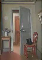 Many of Vallotton's paintings depicted interior apartment scenes, usually with men and women, sometimes hinting at scandal or adultery, sometimes simple scenes such as taking sheets out of a linen closet. The paintings often depicted open doorways or open doors leading to bedrooms. His wife Gabrielle appeared in many of the paintings, and the apartments resembled his own on rue des Belles-Feuilles. This theme is exemplified by his painting Haut de Forme (1887), and was most frequent in his work between 1898 and about 1904.[32]