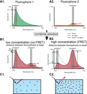 Förster resonance energy transfer (FRET), fluorescence resonance energy transfer (FRET), resonance energy transfer (RET) or electronic energy transfer (EET) is a mechanism describing energy transfer between two light-sensitive molecules (chromophores).[1] A donor chromophore, initially in its electronic excited state, may transfer energy to an acceptor chromophore through nonradiative dipole–dipole coupling.[2] The efficiency of this energy transfer is inversely proportional to the sixth power of the distance between donor and acceptor, making FRET extremely sensitive to small changes in distance.[3]