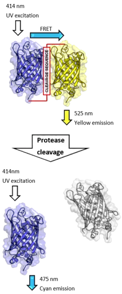 One common pair fluorophores for biological use is a cyan fluorescent protein (CFP) – yellow fluorescent protein (YFP) pair.[26] Both are color variants of green fluorescent protein (GFP). Labeling with organic fluorescent dyes requires purification, chemical modification, and intracellular injection of a host protein. GFP variants can be attached to a host protein by genetic engineering which can be more convenient. Additionally, a fusion of CFP and YFP ("tandem-dimer") linked by a protease cleavage sequence can be used as a cleavage assay.[27]