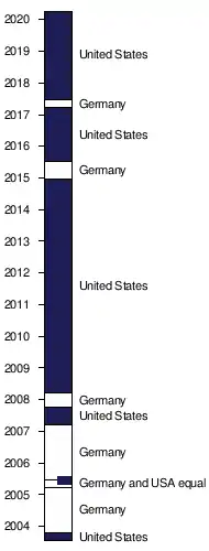 The United States holds the record for the longest consecutive period leading the rankings of nearly 7 years, from March 2008 to December 2014. As of early March 2020, the United States has led for a total of 12 years, Germany for 4½ years, and the two jointly led for ¼ year.