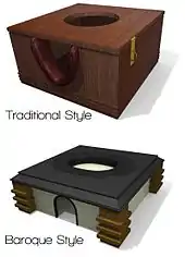 A smotherbox (or "smothering box") is a special form of queening stool which also allows the person under the seat to be locked in place, restrained by the neck as in a set of stocks.[4] A smotherbox has two openings. One is in a vertical side of the box for the neck of the person who has their head inside the smotherbox. The other is in the top of the box to expose their face. The inside of a smotherbox is often padded to provide support for their neck and prevent their head from moving. The padding may also muffle noises from the outside, causing a relaxation effect and heightening their other senses. Smotherboxes are usually custom made pieces of furniture that may have a special significance for their users. They are sometimes made out of precious woods, with leather used for the seat.