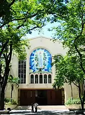 Another masterpiece is within the Student Council Association (SCA) Chapel. Inaugurated on the 8th of December 1957, the SCA Chapel is where religious activities of faculty, personnel, and students are held. Its interior features a mural by Carlos “Botong” Francisco, proclaimed National Artist in 1973 and discoverer of Angono Petroglyphs (which is the oldest known work of art in the Philippines). His painting 14 Stations of the Cross encompasses 260 degrees of one’s visual range.[33] SCA Chapel’s façade is the richly colored tile mosaic of Our Lady of Fatima by Vicente Manansala, also a National Artist who developed the transparent cubism technique apparent in this piece of art.