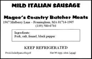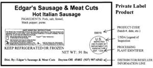 Most processed meat products (sausage, bacon, hot dogs, frankfurters, snack sticks) sold at farmers' markets have labels that include a "distributed by/packed for/etc." statement as well as a government inspection legend. The government inspection legend includes an establishment number (EST #) that identifies the commercial processing plant that made and packaged the products; similar to a package of sausage or bacon sold in supermarkets.[34] Alternately, a processed meat product sold at a farmers' market that does not include a "distributed by/packed for/etc.” statement and a government inspection legend is a product that is made and packaged by the selling vendor. There are also vendors that sell processed meat products that include a government inspection legend without a "distributed by/packed for/etc.” statement; such vendors are selling co-pack products in which the maker/producer prepares and packages the product according to the vendors’ recipe.[35]