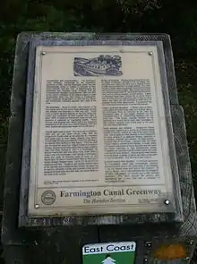 Farmington Canal State Park Trail forms a portion of the Farmington Canal Heritage Trail in the towns of Cheshire and Hamden. The site of the greenway was originally used by the native Quinnipiac tribes as a path prior to its expansion as a road by the colonists.[6] A canal construction project began on July 4, 1825, with the first sections opening in 1828. On June 22, 1836, the Farmington and Hampshire companies were in debt and transferred their ownership to New Haven-Northampton Company, resulting in a loss of more than $1 million in investor capital. In 1847, investors in the company petitioned the state for the right to build a railroad. The approved railroad was constructed in one year on the banks of the canal for a total cost of $186,000.33.[7] Rail service lasted until the 1980s, when Guilford discontinued service. The Farmington Valley Trails Council was founded in 1992 to preserve the canal by converting it into a park.[8] Part of the Farmington Canal State Park trail was dedicated May 22, 1994.[8] Located on North Brooksvale road is Lock 12 Historical Park, a restored canal lock and museum dubbed the "best-preserved relic of Connecticut's canal era."[6][9] The developed section within state park boundaries runs 17.7 miles (28.5 km) south from Hart Street in Southington to Todd Street in Hamden and includes the Farmington Canal's restored Lock 12, located south of Brooksvale Road in Cheshire.