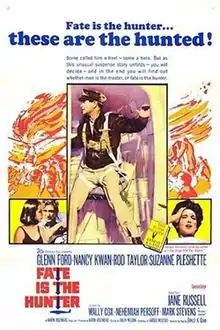 Fate Is the Hunter is a 1964 American black-and-white aviation disaster film from 20th Century Fox, produced by Aaron Rosenberg, directed by Ralph Nelson, that stars Glenn Ford, Nancy Kwan, Suzanne Pleshette and Rod Taylor. Fate Is the Hunter also features Jane Russell (playing herself entertaining for the USO in a flashback sequence), Nehemiah Persoff, Wally Cox, and Mark Stevens. Dorothy Malone also makes an uncredited appearance. The film features an early film score by composer Jerry Goldsmith.[3]