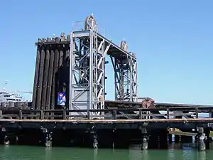 This example, located in San Francisco, California, south of China Basin was a principal crew change point for maritime operations of the Santa Fe Railroad. It is no longer in use. It remains intact but there are no longer any connecting rails along the shoreline - once the province of the San Francisco Belt Railroad, operated along The Embarcadero by the state of California in support of maritime traffic. This was used extensively in an era when large cargo ships would contain crates or pallets of stores, moved to and from the ship's cargo holds by crews of stevedores and on the docks by crews of longshoremen, with the ship's own spar cranes and winches used for movement. Transport to and from the docks was mostly by rail. Rather than make a long trip down the San Francisco Peninsula, railcars were barged about the bay, both by the Santa Fe and by the Southern Pacific. Southern Pacific eventually replaced their multiple tug and barge system with a single specialized ferryboat. Two ferry slips were used by Santa Fe in San Francisco, here near China Basin, and at the north edge of town near the Maritime Museum. Most traffic would be taken across the bay to Oakland or Richmond for connection with the major transcontinental rail lines, with a small amount of traffic for California's northern coastal region (the so-called Redwood Empire) passing through a slip at Tiburon on Richardson Bay.