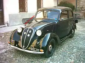 Exterior styling recalled the 1935 Fiat 1500 and the 1936 Fiat 500 "Topolino", with the typical mid-thirties heart-shaped front grille.[6] The main body style for the Fiat 508 C was a 4-door pillarless saloon with 4 side windows (two windows on each side without the rear quarter window), and suicide doors at the rear. Other body styles listed by Fiat were a 4-door convertible saloon (saloon with folding roof, based on the standard 4-door model), a 4-door torpedo, a 2-door 4-seat cabriolet, and, for a brief period, a sporty 2-door 2-seat spider built by Carrozzeria Viotti.