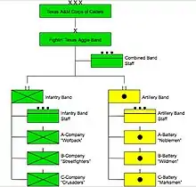 The members of the band are called BQs[32] and, since the band's inception, are part of the Corps of Cadets.[33] The Aggie Band is a major unit in the Corps, comparable in size to a brigade or wing. Unique among Corps units, however, the band is divided into two battalions of three "outfits" each, the Infantry Band and the Artillery Band.[34][35] All BQs are assigned to one of the six outfits. Each battalion is commanded by a Cadet Lieutenant Colonel and has its own command staff; each outfit is commanded by a Cadet Major. Outfits are further divided into platoons, squads, and fire teams,[36] lead by a Cadet Captain, Cadet Staff Sergeant, and Cadet Corporal, respectively.[37] Due to its status as a Senior Military College, all cadets are required to take ROTC classes at least their first two years, though follow-on military service is not required.[7]