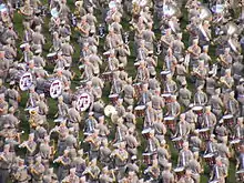 The band has over 400 members, though as of 2019, a typical performance fields slightly over 300 bandsmen.[41][42] Instrumentation consists of more than 60 trumpets, 40 trombones, 30 mellophones, 30 baritones, 25 bass horns, 40 drummers, and 90 assorted woodwinds, though the actual composition varies annually.[29] There are no flutes in the Aggie Band, as their position while being played would hinder the intricate marching maneuvers. Piccolos are used instead. All members of the band must have high school marching experience, an audition during the spring semester leading into the first fall semester of attendance to include major scales and sight reading, and an individual interview with the band director. Prospective members are also encouraged to participate in the Spend the Night with the Corps program to better understand the rigors of life in the Corps of Cadets.[29]
