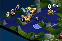 Another difference is the manner in which random battles are encountered. Like other Final Fantasy games, random battles occur on the world map. However, in Final Fantasy Tactics, random battles happen only in pre-set locations, marked in green on the world map.[6] Passing over one of these spots may result in a random encounter. Another major aspect of battles is magical attacks. Certain magical attacks cause area of effect damage, and many of the more powerful magical attacks require several turns of charging.[7] Hit Points of enemy units are also visible to the player (except in the case of certain bosses), allowing the player to know exactly how much damage they still have to inflict on a particular unit.[5]