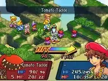 The game's turn-based battles play out in a grid-based arena; each unit on both sides has their turn placed according to their Agility statistic, with the most agile units going first.[2] During their turn, characters can be moved and positioned to face in four directions, and perform actions such as attacking, performing skills and using items.[4] Each unit has health points (HP) and magic points (MP), with MP starting at zero and regenerating with each turn. MP are used to perform magic abilities, with more powerful spells costing more MP. When a Unit's HP is depleted, they are knocked out.[2][4] Some battles are affected by changing weather, which impacts unit movements and abilities.[4]