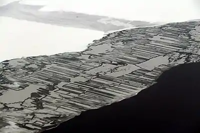 Rafting, also called telescoped ice,[3] is most noticeable when it involves new and young ice, but also occurs in ice of all thicknesses.[4] The process of finger rafting as such is commonly observed inside a lead, once a thin layer of ice (at the nilas stage) has formed. Although this ice is typically very weak (it is unable to support its own weight outside the water), it contains a lot of brine and is also relatively warm, since being that thin, its temperature is near that of the water. Rafting is accompanied with rapid draining of the brine inside the overlying ice sheet. This brine acts as a lubricant, significantly reducing the friction between the two sheets during overthrusting. Such a mechanism, and the fact that the upper surface of nilas is already slippery, account for overthrust distances in excess of 100 metres (330 ft) (a length-to-thickness ratio of 1000 to one).[4][note 2]