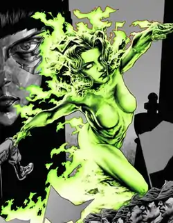 After the Crisis on Infinite Earths, her history was altered so that she had followed an unusual career path. Renamed Beatriz Bonilla da Costa, she started as an amateur model on the beaches of Rio, then becoming a showgirl and stage performer before finding herself serving as a top secret agent for Brazilian government's SNI (Serviço Nacional de Informações - National Information Service), actually Abin (Agência Brasileira de Inteligência - Brazilian Intelligence Agency). In the course of one of her missions, Beatriz was trapped in a pyroplasmic explosion that endowed her with the unusual power of being able to exhale an eight-inch burst of fire. She assumed the identity of the Green Fury, and then soon changed it again to Green Flame. She joined the international superhero team the Global Guardians, of which she was a long-standing, loyal member.[3]