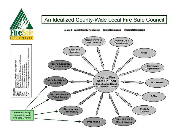 In support of the community-based efforts, CDF began including these local groups in its Fire Safe Council. The coalition was headed by the CDF Public Education Officer.[7] Sometime after 1996, as more and more communities started local Fire Safe Councils throughout the state, the Fire Safe Council became known as the California Fire Safe Council (CFSC). The CFSC was a precursor of the current California Fire Safe Council, Inc. (CFSCI).