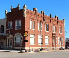 The building footprint covers a rectangular plot size of 24 feet (7.3 m) by 90 feet (27 m).[lower-alpha 1] It was constructed of pressed brick and sandstone, and was assessed in "excellent condition," at the time of the NRHP application. The building facade is decorated with white stone, wooden columns and towers. The ground floor has a horseshoe window of white stone, bordered by red brick, and a narrow door supported by wooden columns. The right side has five more windows, a bay window and a plain door. The upper story has two double windows on the front and five more windows on the right side of the building.[2]