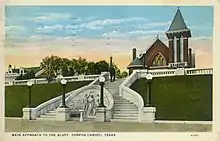 Early in the 1900s lots were purchased where the present Wells Fargo Tower, formerly the elegant Driscoll Hotel, is located. A handsome red brick structure was erected by Henrietta King, now a widow, in memory of her husband, Capt. Richard King, with a beautiful Tiffany stained glass windows in memory of her father, the Rev. Hiram Chamberlain, who had established the first Presbyterian church in South Texas at Brownsville in the 1850s. Following the disastrous hurricane and tidal wave of 1919, the Red Brick Church served as shelter and sustenance for the city. Members of the congregation worked from daylight until late at night at the church to help withy relief, and the women of the church provided meals to about 700 people a day who had been left homeless by the storm.[6]