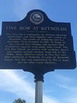 Five Row was a community for African American farmhands and their families who worked in the Reynolda Village and Reynolda House in Winston-Salem, North Carolina.[1][2] It was characterized by two rows of 5 houses as well as a school house that was used on Sundays as a church.[3] This community was situated in the most unattractive part of the estate, despite Reynolds' attempts to improve it. Residents of Five Row did not have the amenities that the rest of the estate possessed, however they had front porches and private hedges with flowers. The community was demolished in 1961 and has since been used for the construction of the city's second highway Silas Creek Parkway.[4]