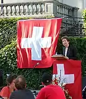 The current flag law of the Swiss Confederacy is the Wappenschutzgesetz (WSchG, SR 232.21) of 2013 (in force since 2017).[24] This law replaced the flag law 1931 (last revised 2008).[25] The 2013 law for the first time defines both the Swiss flag and the Swiss coat of arms based on an image, declared as authoritative in the text.[26]