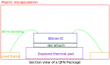 The figure shows the cross section of a flat no-lead package with a lead frame and wire bonding. There are two types of body designs, punch singulation and saw singulation.[3] Saw singulation cuts a large set of packages in parts. In punch singulation, a single package is moulded into shape. The cross section shows a saw-singulated body with an attached thermal head pad. The lead frame is made of copper alloy and a thermally conductive adhesive is used for attaching the silicon die to the thermal pad. The silicon die is electrically connected to the lead frame by 1–2 thou diameter gold wires.