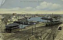 The first terminus had a single platform 30 metres long, and was located beside the Fish Market building on the south-west corner of Swanston and Flinders Streets.[12] An additional platform was provided in 1877, along with two overhead bridges to provide passenger access, followed by additional timber and corrugated iron buildings and a telegraph station in 1879.[11] The first signal boxes were opened at the station in 1883, one at each end of the platforms.[13] By the 1890s, a third island platform had been constructed.[13]