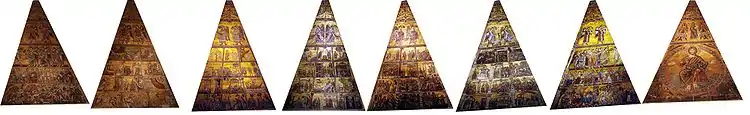 The other scenes on the lower zones of the five eastern sections of the dome depict different stories in horizontal tiers of mosaic: (starting at the top) stories from the Book of Genesis; stories of Joseph; stories of Mary and the Christ and finally in the lower tier, stories of Saint John the Baptist, patron saint of the church. A total of sixty pictures originated in the last decade of the thirteenth century. The key artists employed were Corso di Buono and Cimabue. It is the most important narrative cycle of Florentine art before Giotto.[17]