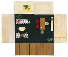 One of Knoll's main challenges was convincing executives and the public to adopt a modernist aesthetic. Knoll Showrooms played a key room in selling the public on modernist design, but Knoll was also gifted at convincing executives to hire Knoll to transform their offices. Knoll was renowned for her how she communicated and presented the designs of the Knoll Planning Unit through what she referred to as "paste-ups".[5][16] A "paste-up" was a general graphic-arts term for any draft or finished mechanical flat art, traditionally using an adhesive commonly used in fashion and set design. Knoll was the first to use the method for interior design presentation. Her paste-ups were small representational plans of the space with fabric swatches, wood chips and finishes attached to represent furniture and other details.[4] Knoll used the paste-ups to convey the feeling and experience of the space, in the pictured example the color and texture of the materials used better represented the humanized modernism that was essential to Knoll's designs.[4] The paste-ups were essential in overcoming resistance to change, they gave executives something they could identify with, making them feel comfortable in adopting Knoll's new aesthetics.[5]