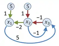 Using the examples from the subsection Elements of signal flow graphs, we construct the graph In the figure, a signal-flow graph in this case. To check that the graph does represent the equations given, go to node x1. Look at the arrows incoming to this node (colored green for emphasis) and the weights attached to them. The equation for x1 is satisfied by equating it to the sum of the nodes attached to the incoming arrows multiplied by the weights attached to these arrows. Likewise, the red arrows and their weights provide the equation for x2, and the blue arrows for x3.
