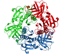 The fluorinase enzyme (EC 2.5.1.63, also known as adenosyl-fluoride synthase) catalyzes the reaction between fluoride ion and the co-factor S-adenosyl-L-methionine to generate L-methionine and 5'-fluoro-5'-deoxyadenosine, the first committed product of the fluorometabolite biosynthesis pathway.[1] The fluorinase was originally isolated from the soil bacterium Streptomyces cattleya, but homologues have since been identified in a number of other bacterial species, including Streptomyces sp. MA37, Nocardia brasiliensis and Actinoplanes sp. N902-109.[2] This is the only known enzyme capable of catalysing the formation of a carbon-fluorine bond, the strongest single bond in organic chemistry.[3]