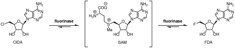 The reaction catalysed by the fluorinase is reversible, and upon incubation of 5'-fluoro-5'-deoxyadenosine and L-methionine with the fluorinase, SAM and fluoride ion are produced.[9] Replacing L-methionine with L-selenomethionine results in a 6-fold rate enhancement of the reverse reaction,[9] due to the increased nucleophilicity of the selenium centre compared to the sulfur centre.