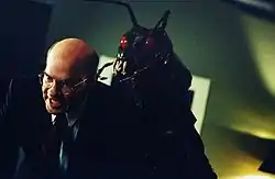 The episode's bug antagonist was actually a prosthetic suit worn by a stuntwoman. The suit was highly ridiculed behind the scenes; reportedly, actor Markinson, upon seeing the costume, said "This is what's driving me crazy?"[2] Director Kim Manners too thought the costume was ridiculous and sardonically told people that the episode would ruin his career.[2] Gilligan attributed the problems due to the episodic work schedule, he noted, "We're usually on such a short schedule that there has to be a weak link somewhere".[2] Gilligan also stated that the "overengineered" aspects of the suit made it somewhat comical.[2] To fix the perceived issues with the monster, the production team gave the filmed footage to visual effects editor Laurie Kallsen-George, who "took the footage with the monster in it, erased the monster completely, took the monster to a different screen [...] animated it, and added speed blur".[2] These effects were time-consuming and were only finished the day the episode aired.[2][4] In the finished episode, the monster is not clearly visible, which allowed the scariness of the episode to be more real. Gilligan approved of Kallsen-George's work, saying, "There's a long noble history to [obscuring the monster]. The truth is your imagination can be much more effective than real life."[2]