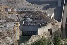 Folsom Power Plant is located on the north side of the river, at the base of the dam. It has three Francis turbines with a combined capacity of 198.72 megawatts (MW), uprated from its original capacity of 162 MW in 1972.[6] The power plant's electricity production is intermediate, between peaking and base load. It generally operates during the day, when the demand and price for electricity is the highest. The plant produces an average of 691,358,000 kilowatt hours each year.[1]