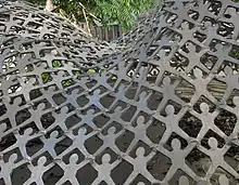 The memorial is a six-metre-high funnel-shaped sculpture. It is made up of 3,000 aluminium men who symbolically grab each other's hands and are connected to each other by their feet. This funnel is placed on a light dome of the subway station at the Plärrer and can be therefore viewed both at street level in the form of a dome and underground in its continuation as a cone in the foyer of the mezzanine floor and the pedestrian underpass.