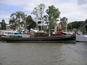 The tug was launched on 20 November 1925 and sailed from the River Clyde on 21 December, reaching Brisbane on 7 March 1926.[1][2] After voyage repairs, she was registered at Brisbane on 31 March 1926 with Official Number 139366 and entered service in the port of Brisbane.[2] In addition to her regular ship-berthing duties, she was deployed as required as a salvage tug on the Queensland coast.[1] After her naval requisition in World War II she resumed her service at Brisbane but in due course was overtaken by newer technology; by 1964 she was the last coal-burning steam tug on the River Brisbane. On 28 September 1970 she was retired from service and laid up.[1]