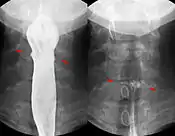 Fishbone pierced in the upper esophagus.Left image during swallowing contrast medium, right image after swallow only dimly visible.