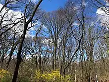Forest Park's trees include the Northern red oak (Quercus rubra), Scarlet oak (Quercus coccinea), Tulip tree (Liriodendron tulipifera), Shagbark hickory (Carya ovata), White oak (Quercus alba), American beech (Fagus grandifolia), American sweetgum (Liquidambar styraciflua), and Black cherry (Prunus serotina). Several trees in the park are more than 150 years old, and create a canopy with an under-layer of Dogwood (Cornus), Virginia creeper (Parthenocissus quinquefolia), Sassafras (Sassafras albidum), and Corktree (Genus Phellodendron). Wildflowers such as white wood aster cover the forest floor in spring, as the azaleas, dogwoods, forsythia, and other flowering plants begin to bloom.[1]