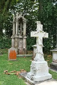 St Joseph's Church was a Roman Catholic chapel built at Bukit Timah for the Chinese congregation, and was named St Joseph at the request of the Reverend John M Beurel. It was opened on Sunday, 6 June 1846, and the first burial at the cemetery is recorded as being on 7 November 1846. Following that, over 400 burials are recorded to have taken place in that cemetery. However, in May 1984, it was recorded that the cemetery was badly overgrown with weeds and vegetation, and that a majority of the tablets were already broken.[5]
