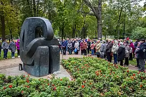 The Formula of Sorrow is a monument to Jewish victims of Nazism, killed in 1941 in the city of Puschkin during the World War II. The memorial is located in the park at the intersection of Dvortsovaya and Moskovskaya streets, not far from the Alexander Palace, near which mass executions took place. In total, about 3,600 Jews were killed in the Nazi-occupied Leningrad Oblast, of which about 250-300 were in Pushkin. During the Soviet era, the Holocaust was hushed up by the authorities. It was not until the 1980s that a group of Jewish activists began to investigate the history of the genocide of Jews near Leningrad (Saint Petersburg). On October 13, 1991, on her initiative, a monument to Jewish victims of Nazism was opened. The central part of the memorial was a sculpture by the cult underground Soviet artist Vadim Sidur "The Formula of Sorrow". The architectural design of the monument was created by Boris Bader. The memorial slab, made as a projection of the Star of David, contains a quotation from the Psalms in Hebrew and Russian, as well as an inscription dedicated to the murdered Jews.[1][2]