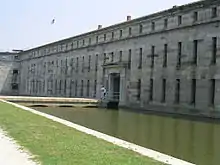 Pea Patch Island emerged as a mud bank in the Delaware River in the 18th century. According to folklore, the island received its name after a ship full of peas ran aground on it, spilling its contents and leading to a growth of the plant on the island.[1] By 1814, the island had grown sufficiently large for the construction of Fort Delaware. The original wood structure was replaced by the current brick and concrete one in 1859.[2] During the American Civil War, Fort Delaware was used by the Union as a camp for Confederate prisoners, in particular those captured in 1863 at the Battle of Gettysburg.[2] Many of the prisoners who died at the fort are buried at nearby Finns Point National Cemetery in New Jersey.