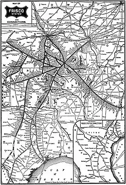 ![]() Map of the Frisco system about 1901-1903, showing planned extensions of the newly acquired FW&RG from Brownwood to Spofford and San Antonio | |