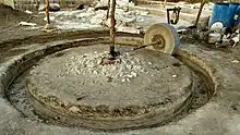 The gates of medieval Indian forts were highly decorated.[9] Two distinct styles are seen. The Hindu style with a lintel and the Mughal style with an arch. Gates in Indian forts were often high and wide to allow elephants to pass.[10] Often they had rows of sharp, stout iron spikes to dissuade an attacking army from using elephants to break down the gates.[11] Such a gate with spikes can be seen on the Shaniwarwada fort, Pune. The walls of the forts were often looked higher from the outside than the inside as the forts made use of the natural rock formations on hills. This not only gave an illusion of greater height but also lead to the lower walls of the fort to be entirely made up of natural rock providing almost a perfect defense against the use of a battering ram or elephants to tear down the walls.[12] The main gate to the forts was located mostly facing north direction, this was to avoid its deterioration by the rains, winds and the sun.