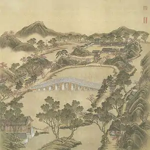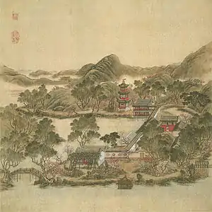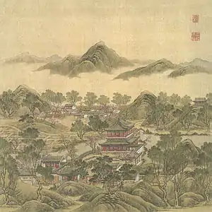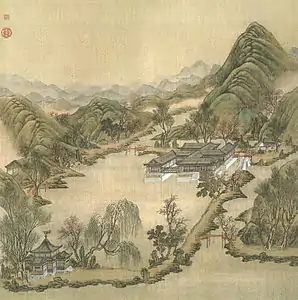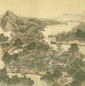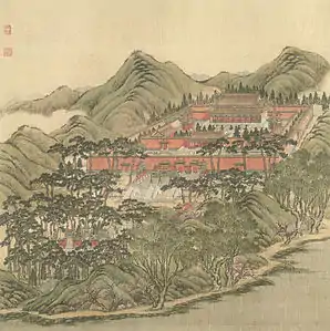 The painting series Forty Scenes of the Yuanmingyuan depicts historically recognized vistas in the Old Summer Palace in Beijing, China. In 1744, the Qianlong Emperor commissioned a set of forty paintings from two court artists, Shen Yuan and Tangdai, and a calligrapher, Wang Youdun.[1] The paintings, currently in the collection of Bibliothèque nationale de France, are among the few remaining visual records of the Yuanmingyuan prior to the sack by French and British troops in 1860.[1] Twenty-four out of the forty garden scenes depicted in paintings were lost in the destruction of 1860, the remaining scenes have been lost over time since then.[2]