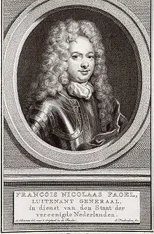 François Nicolas Baron Fagel (3 February 1655, in Nijmegen – 23 February 1718, in Sluis) was an infantry general serving the Habsburg Netherlands. He was a nephew of Gaspar Fagel and was noted for his part in various French defeats at Fleurus in 1690, Mons, siege of Namur, Ramillies and Malplaquet. He also fought in the Portuguese army and took part in the capture of Valencia and Albuquerque.