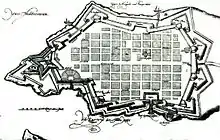 Laparelli laid out the town plan based on a grid pattern to allow sea breezes to flow through the city more easily in the summer, and designed the drainage system. He specified that ramparts were to surround the city, and Fort Saint Elmo was to be rebuilt at the tip of the Scebarras peninsula.[3] The foundation stone of the new city of Valletta was laid in March 1566.[2] Philip II of Spain sent Giovan Giacomo Paleari Fratino to check the design of the fortifications. Giacomo Bosio has recorded the discourse between el Fratino and Laparelli that took place early in April 1566.[5] The final proposal, published on 18 June 1566, was for a fortified city that extended up the peninsula to Fort Saint Elmo, with four bastions and two cavaliers guarding the landward side. In 1567 the plan was refined to cover making the landward ditch deeper and constructing cisterns, storerooms, magazines and other essential buildings.[6]