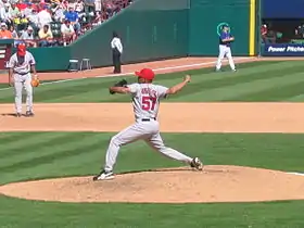 Rodríguez received his second career DHL Delivery Man of the Month Award after posting 11 saves in 12 appearances during the month of June.[3] Rodríguez set a major league record by recording his 35th save before the All-Star Break, breaking the previous record of 34 set by John Smoltz in 2003.[4] He was a member of the American League All-Star Team for the third time and made a brief appearance in the game, facing two batters while walking one.[5] On August 20, 2008, he set both his and the Angels single season record with his 48th save.[6] With his 50th save on August 24, 2008, Rodríguez became the first relief pitcher to reach that number since Mariano Rivera in 2004 and the ninth overall.[7] He was also the youngest pitcher to ever reach that number at 26 years, 7 months, and 17 days. In addition, he reached that milestone in 129 team games, faster than any pitcher in history.[8] With three saves during the week of August 18–24, including the milestone of number 50, Rodríguez was awarded the American League Player of the Week for the first time in his career.[9]