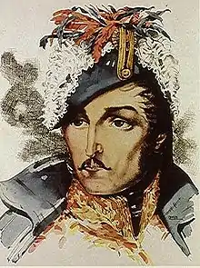 A law student, he began his military career at the young age of eighteen, following the establishment of juntas in 1810, which began the process of independence in New Granada. Santander enlisted in the revolutionary army in October 1810, in the battalion the National Guard ("Guardias Nacionales").[1] He first served as a soldier in army of the federalist United Provinces of New Granada, under the command of General Antonio Baraya, that fought against General Antonio Nariño, of the Province of Cundinamarca, who had refused to recognize the authority of the Union.[4] During these campaigns Santander achieved the rank of colonel in 1812. After the royalist forces re-conquered New Granada, Santander like many other New Granadan officers retreated to the plains east of the Cordillera Oriental, the Llanos, near the modern Venezuelan border. There, Santander joined forces with Venezuelan patriots and operated under the command of Simón Bolívar. During the military campaign across the Andes, Bolívar promoted Santander to Brigadier General in 1817.[4]